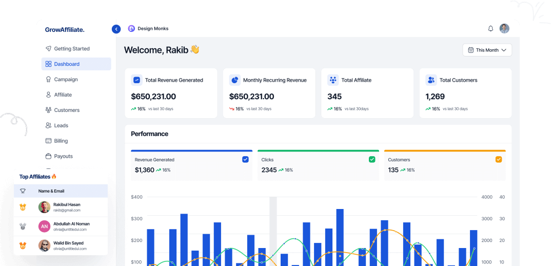 Get a complete view of how your campaigns and affiliates are performing. Track clicks, conversions, and commissions in real-time.